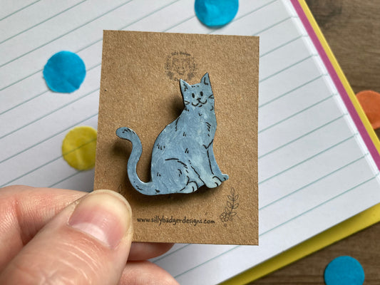Luna | British Blue Cat Pin Badge | Hand Painted Wooden Cat Pin Badge Accesory