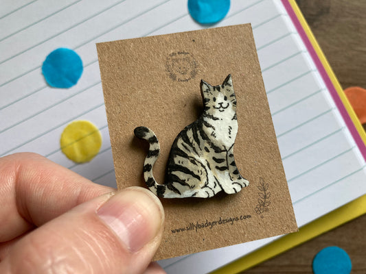 Charli | Tabby Cat Pin Badge | Hand Painted Wooden Cat Badge Accessory