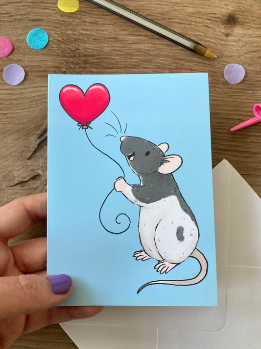 Heart Balloon Rat | Hooded Heart Rat A6 Greeting Card