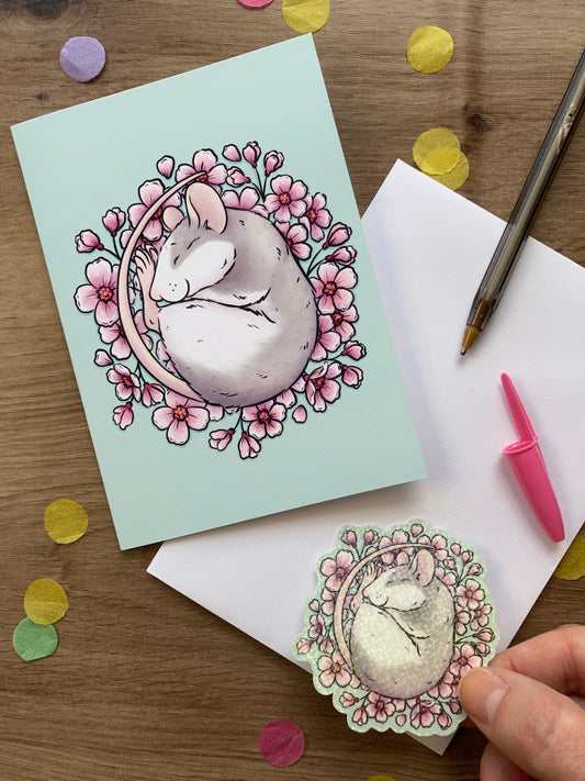 Cherry Blossom Rat Card and Sticker Bundle | Cute Rat Greeting Card And Matching Vinyl Rat Sticker