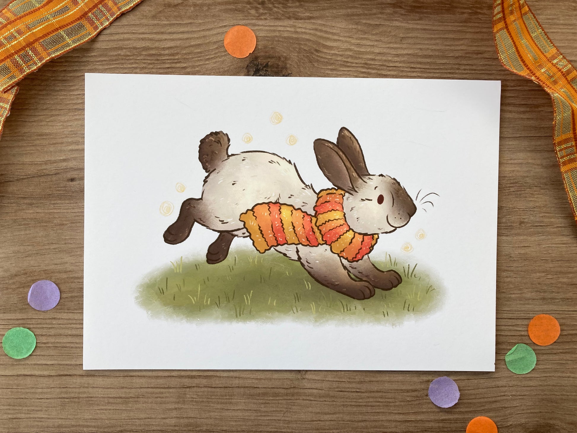 A cute art print featuring a happy bunny wearing a scarf running around in the crisp autumn air.