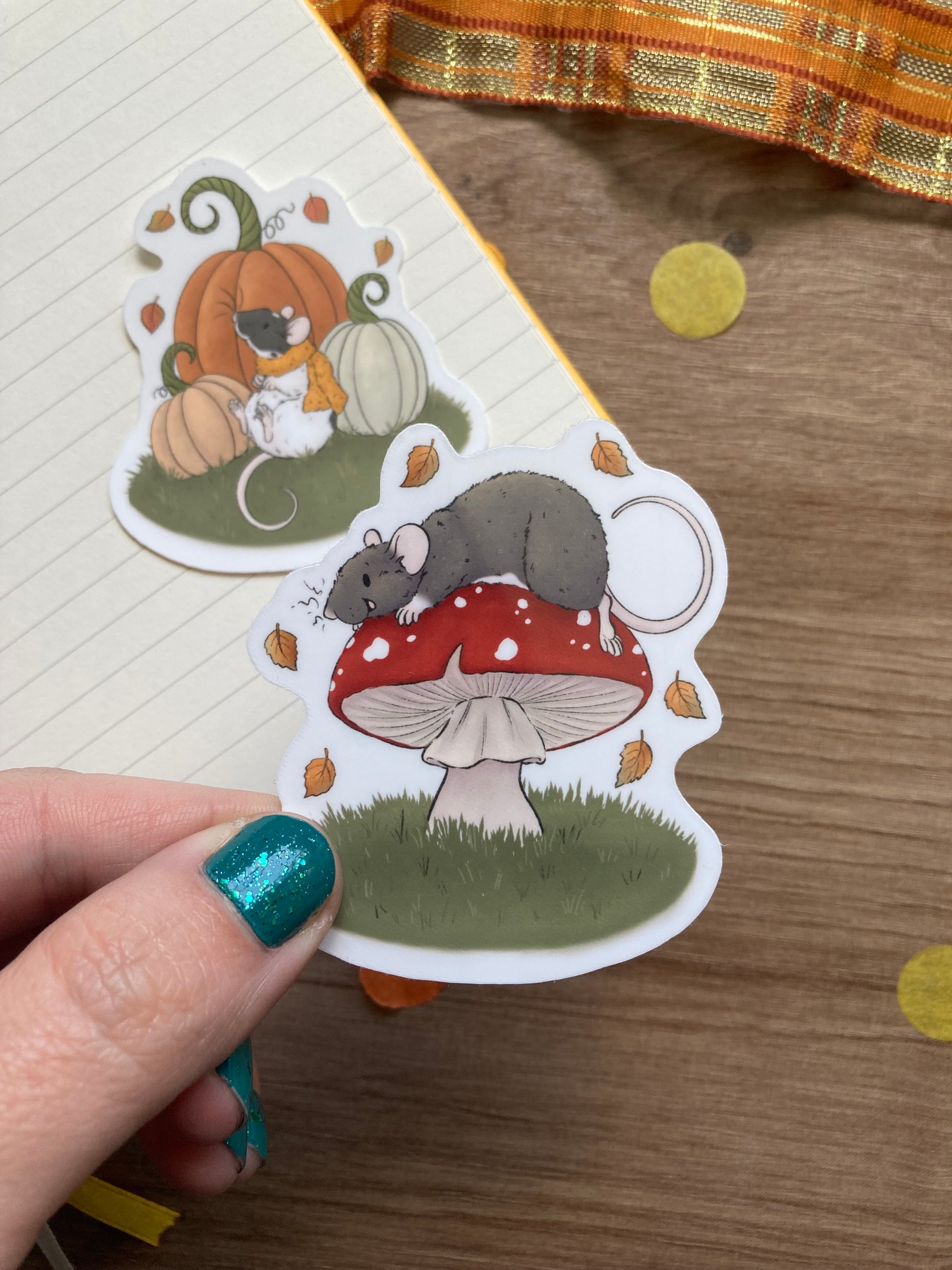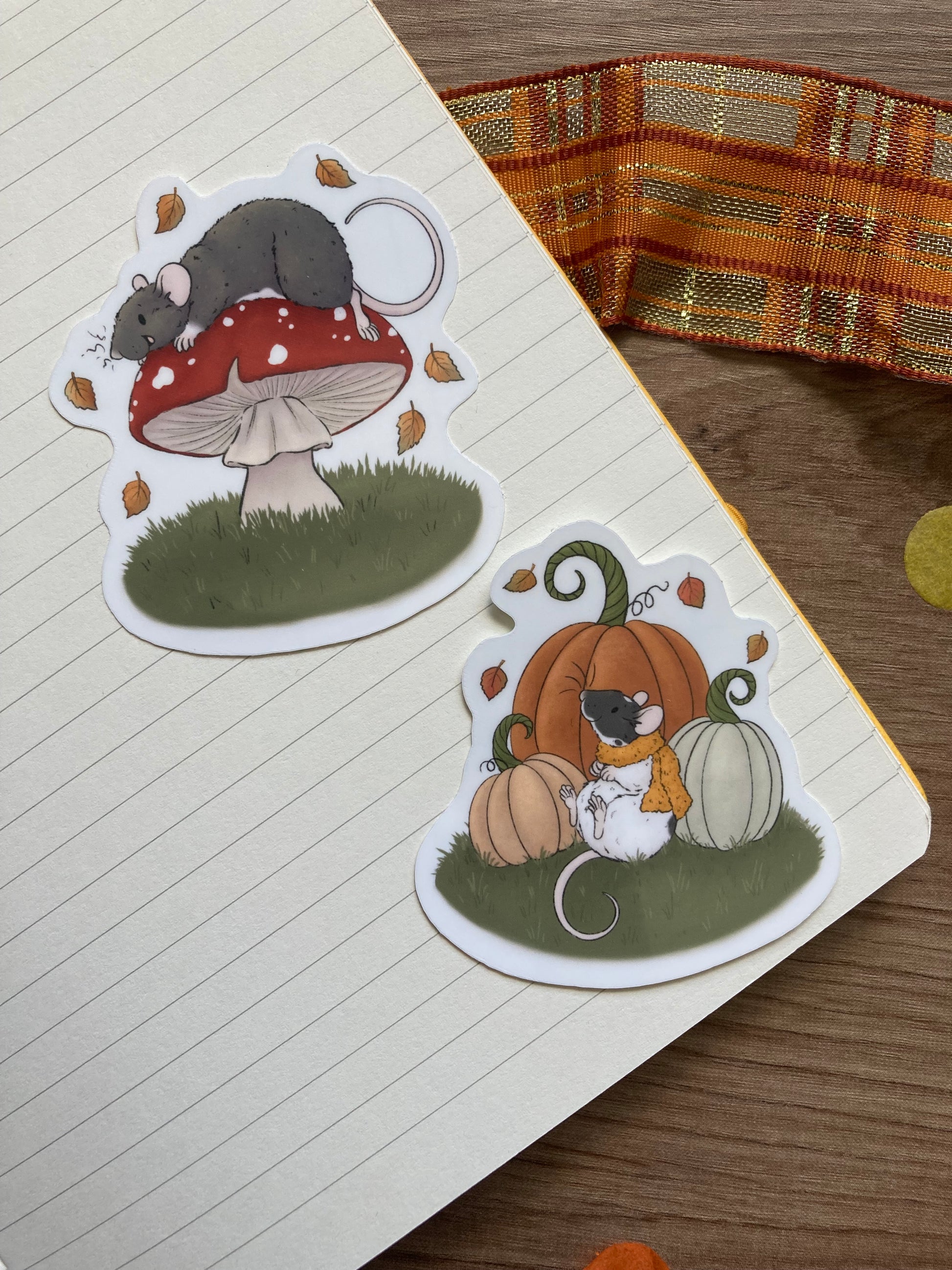 A cute glossy vinyl sticker pack featuring two designs: one of a black and white capped rat enjoying being in amongst pumpkins, and the other being of a black self rat enjoying climbing on a toadstool!