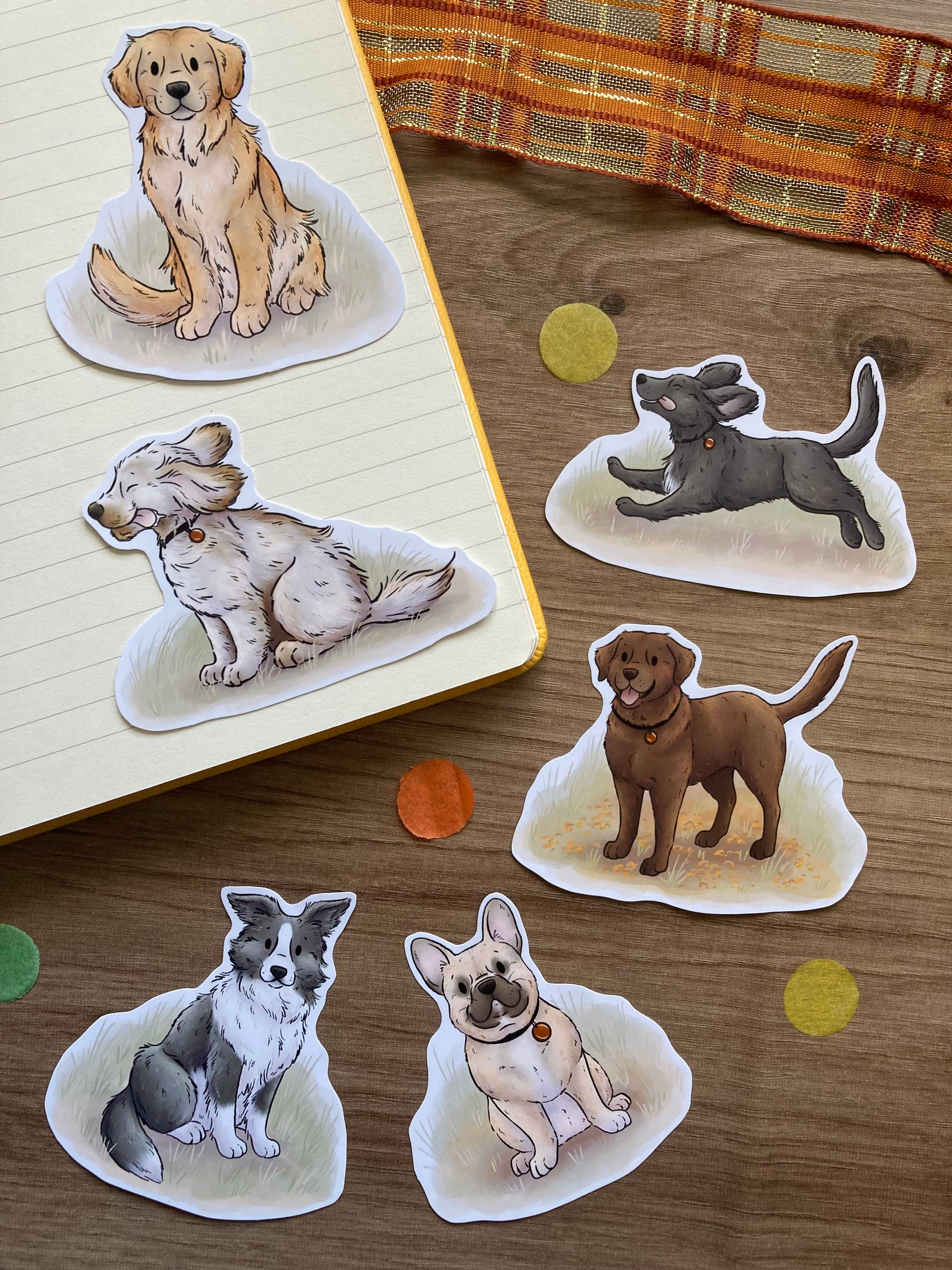 A cute glossy vinyl sticker pack featuring all of the autumn walkies collection, including a Golden Retriever, spaniel, Labrador, Frenchie, Border Collie and a dog enjoying the autumn breeze.
