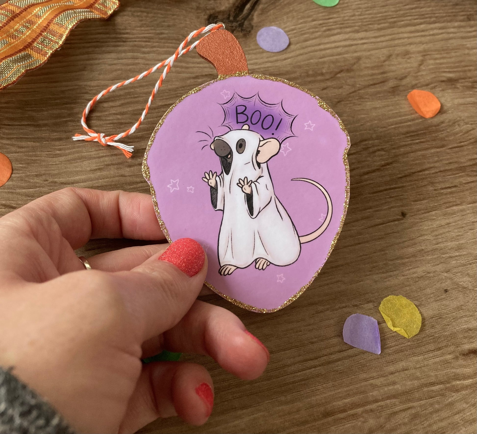 A wooden acorn ornament with a spooky ghost rat saying boo on the front.