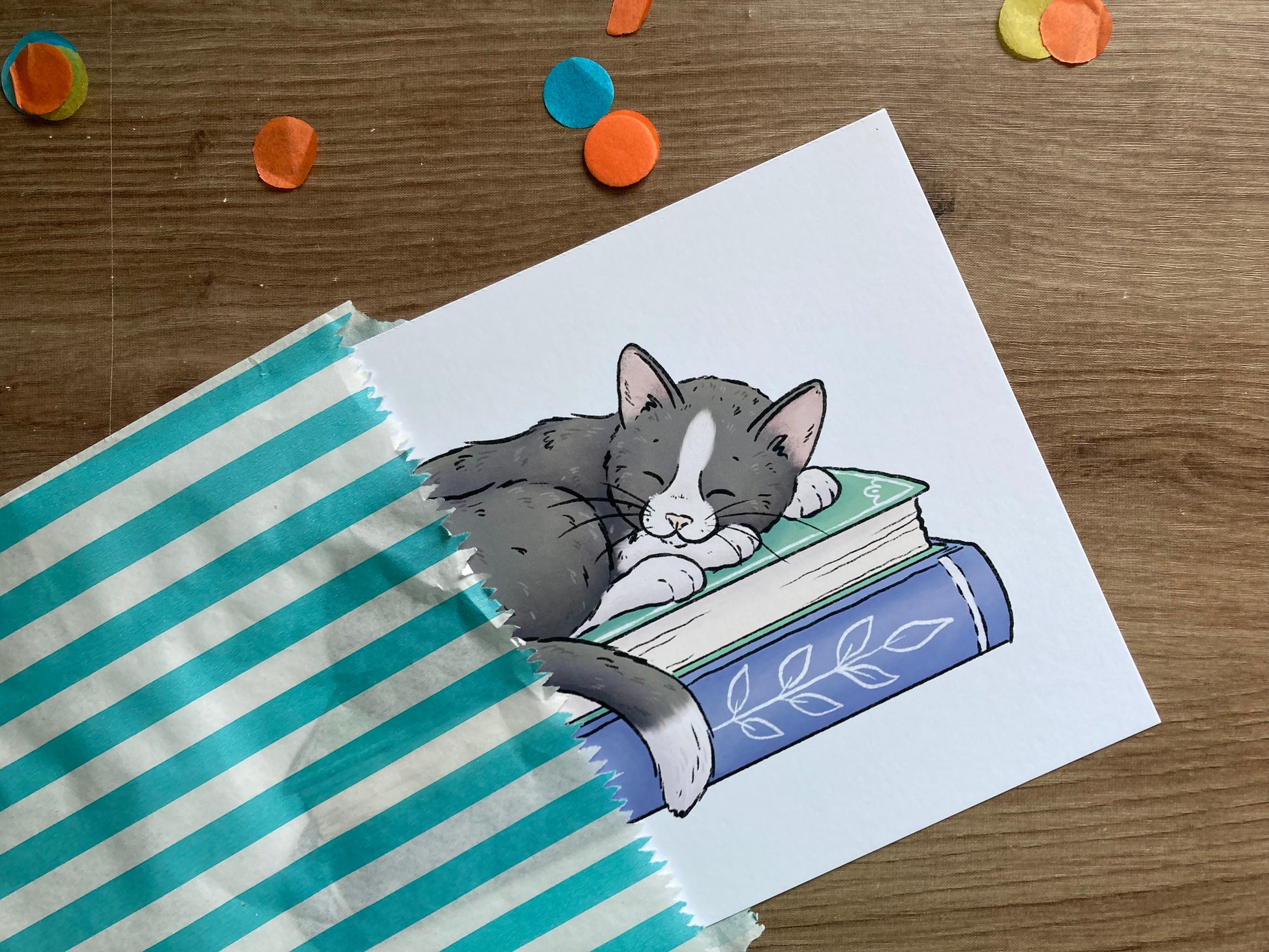 A cute art print featuring a cute little black and white cat lying on a pile of books.