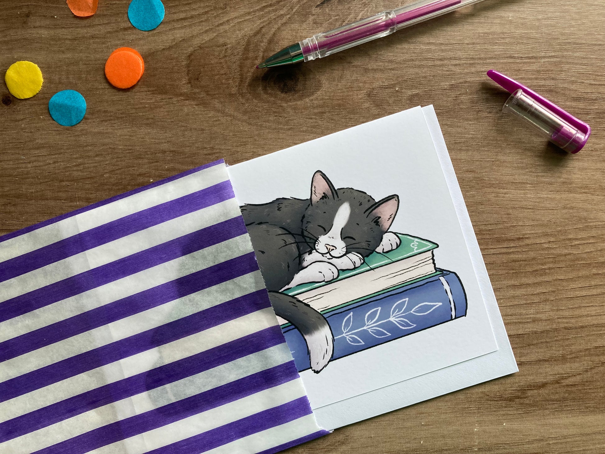 To avoid extra plastic waste every cat greeting card is packed in a paper bag or tissue paper instead of a cellophane bag, making them environmentally friendly.
