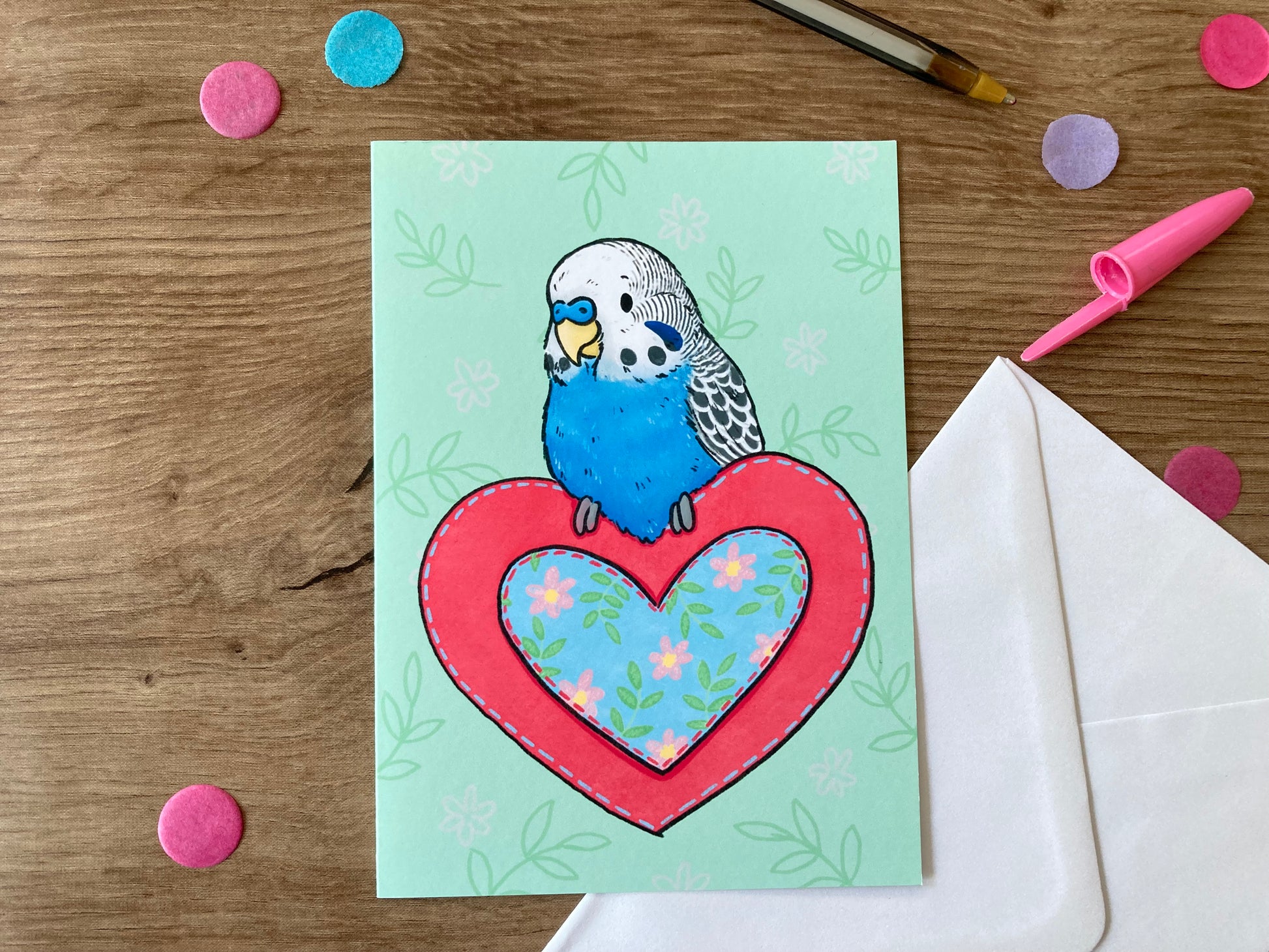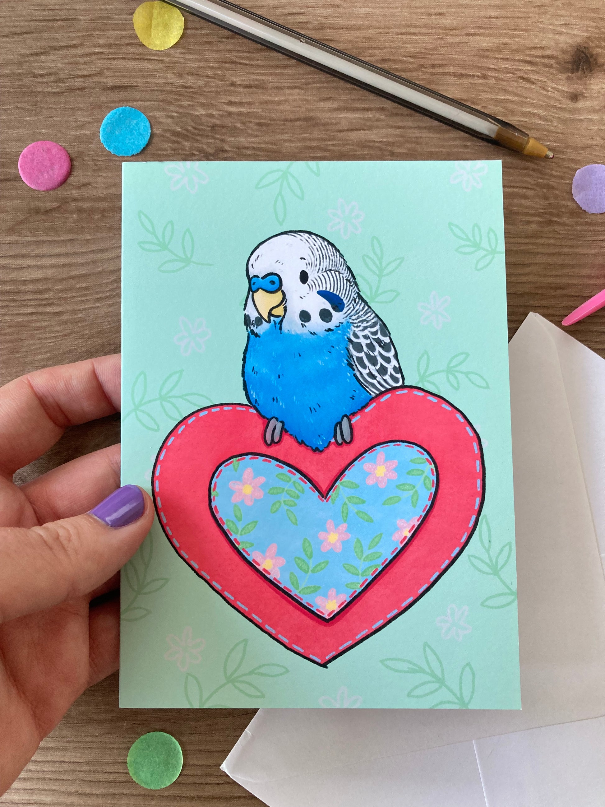 Cute budgie sitting on a heart Valentine’s Day Card.