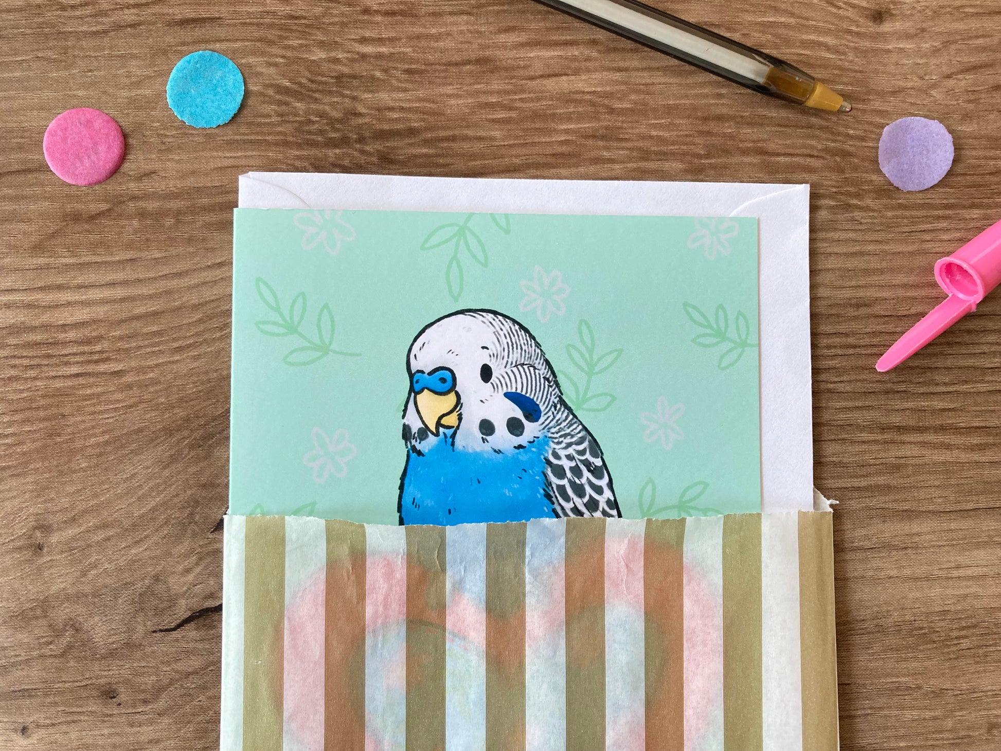 To avoid extra plastic waste every budgie greeting card is packed in a paper bag or tissue paper instead of a cellophane bag, making them environmentally friendly.
