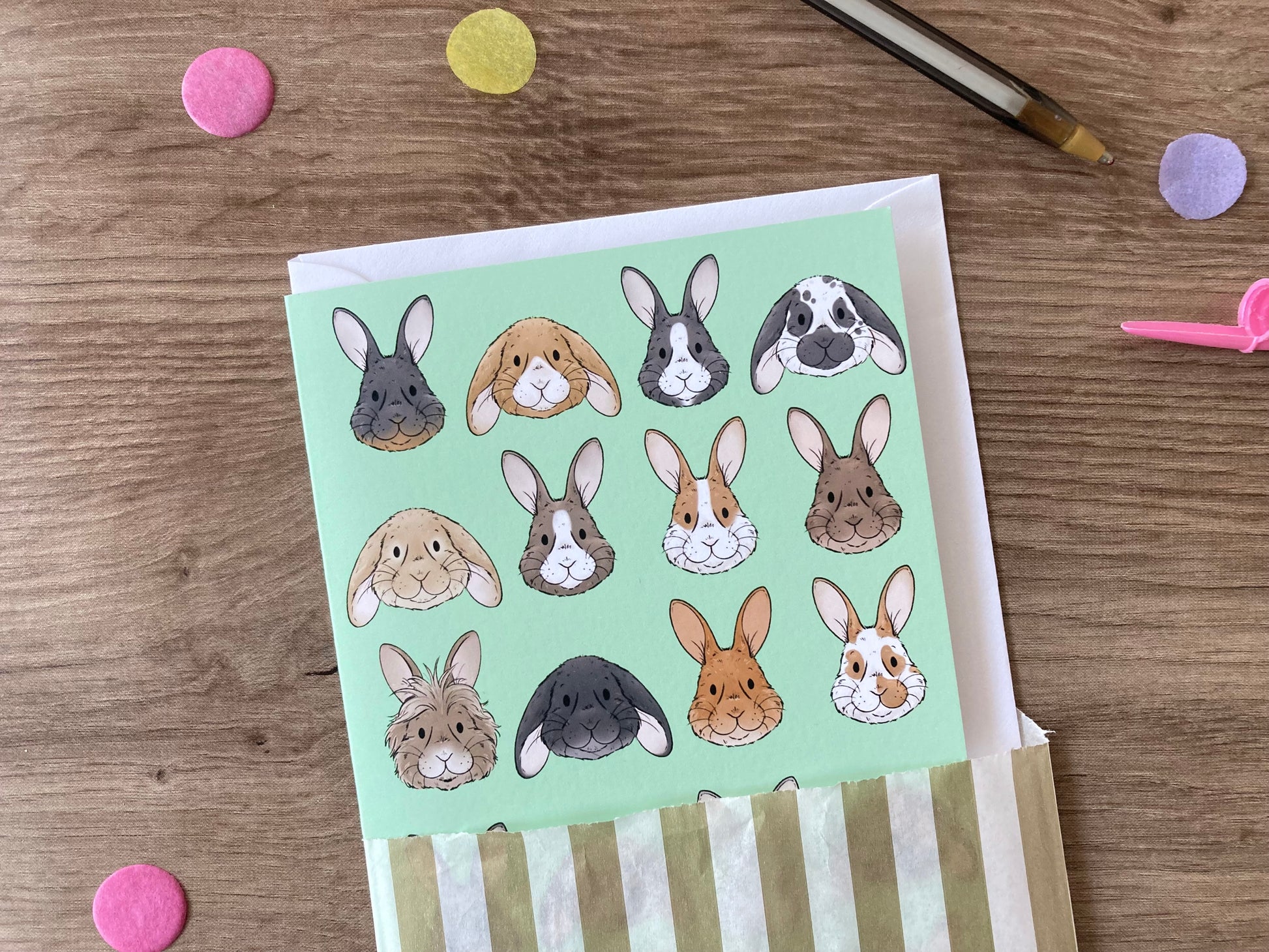 A blank A6 bunny greeting card featuring a bunny faces design. A great card for a rabbit lover for any occasion.