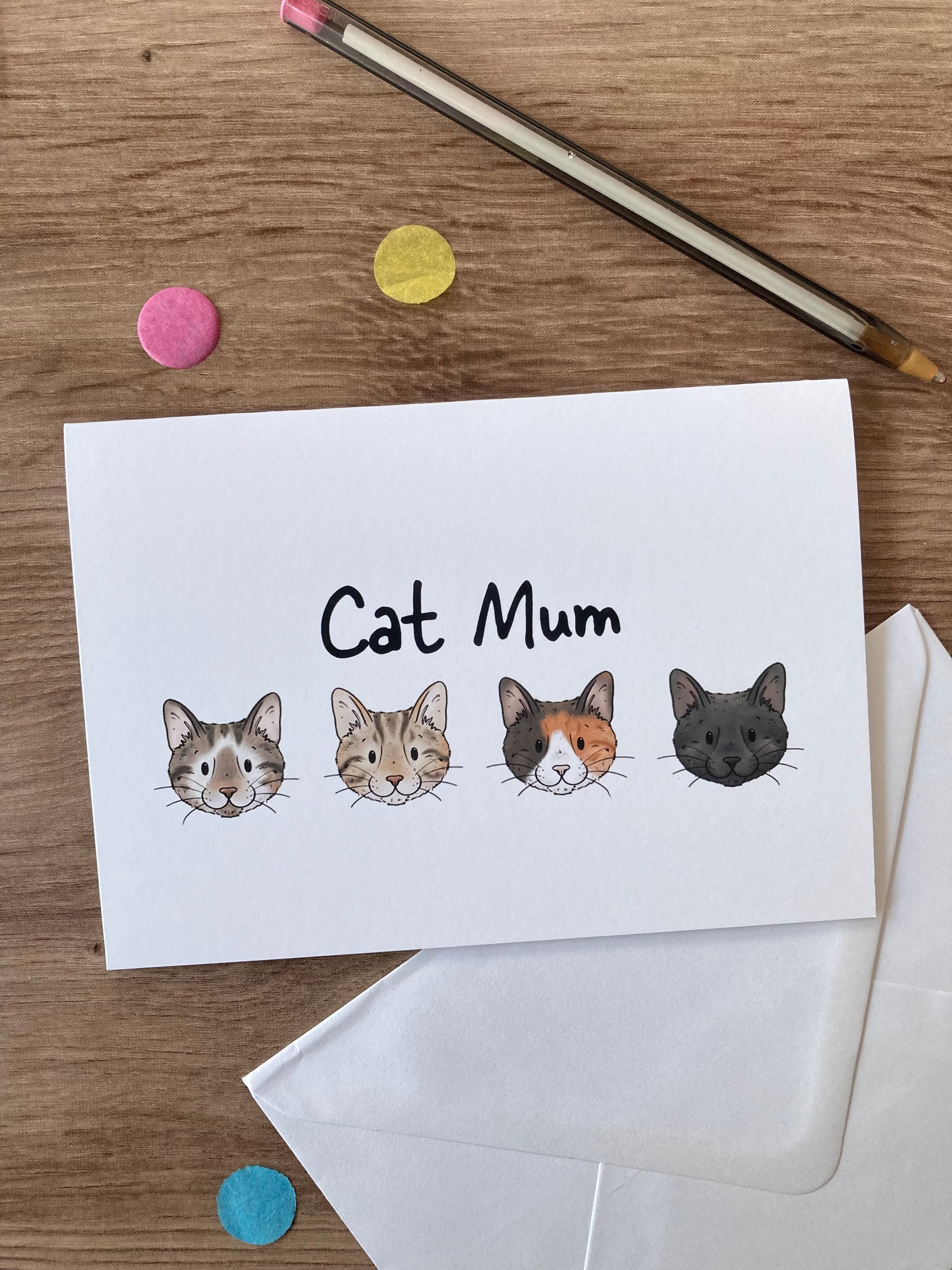 The card features a cute collection of cat faces with the words cat mum at the top.