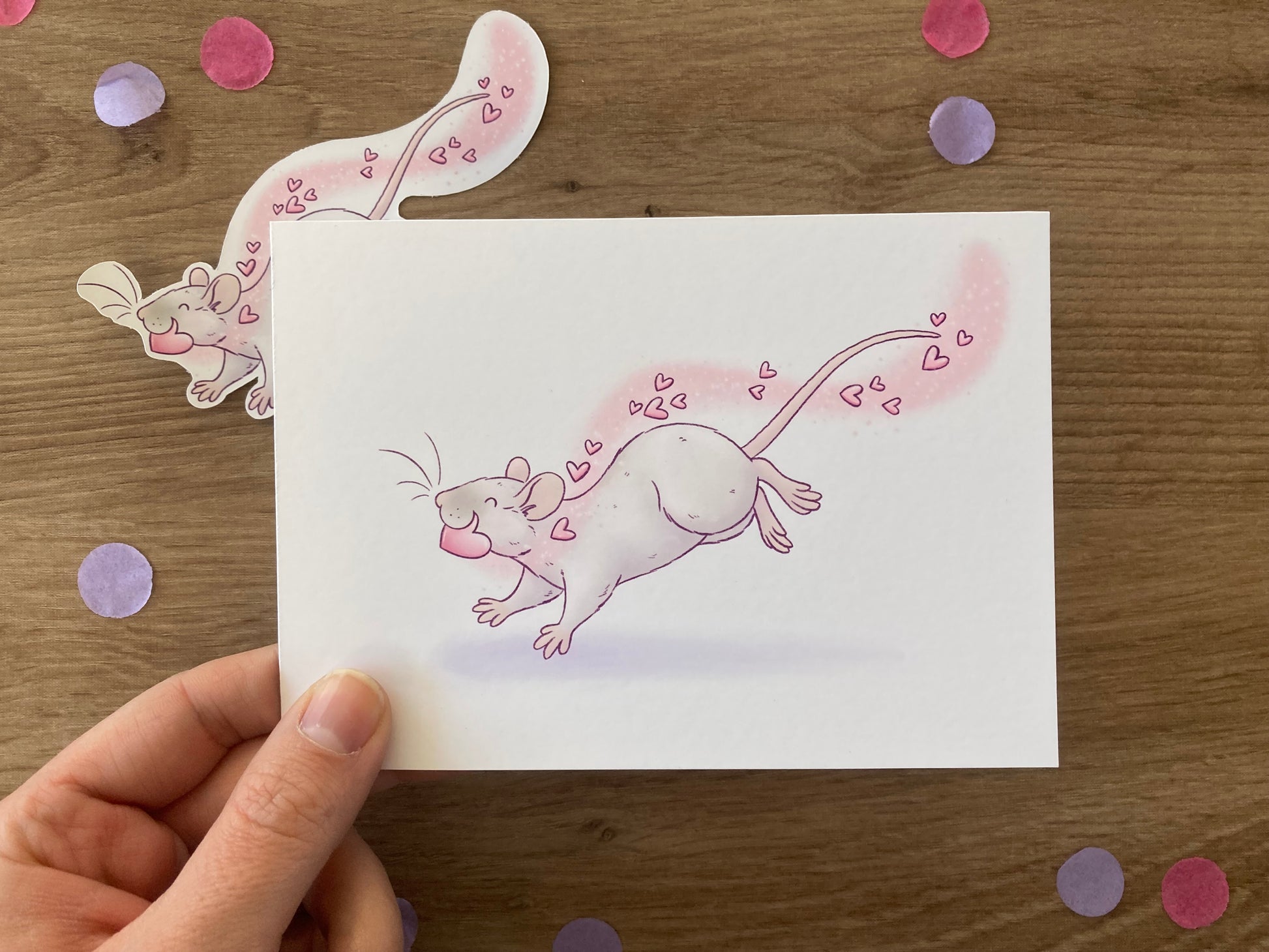 Spread the love around with this ratty bundle of Eugene the rat bouncing around sharing his heart. This design is printed on a glossy vinyl sticker and on an A6 art print as well.