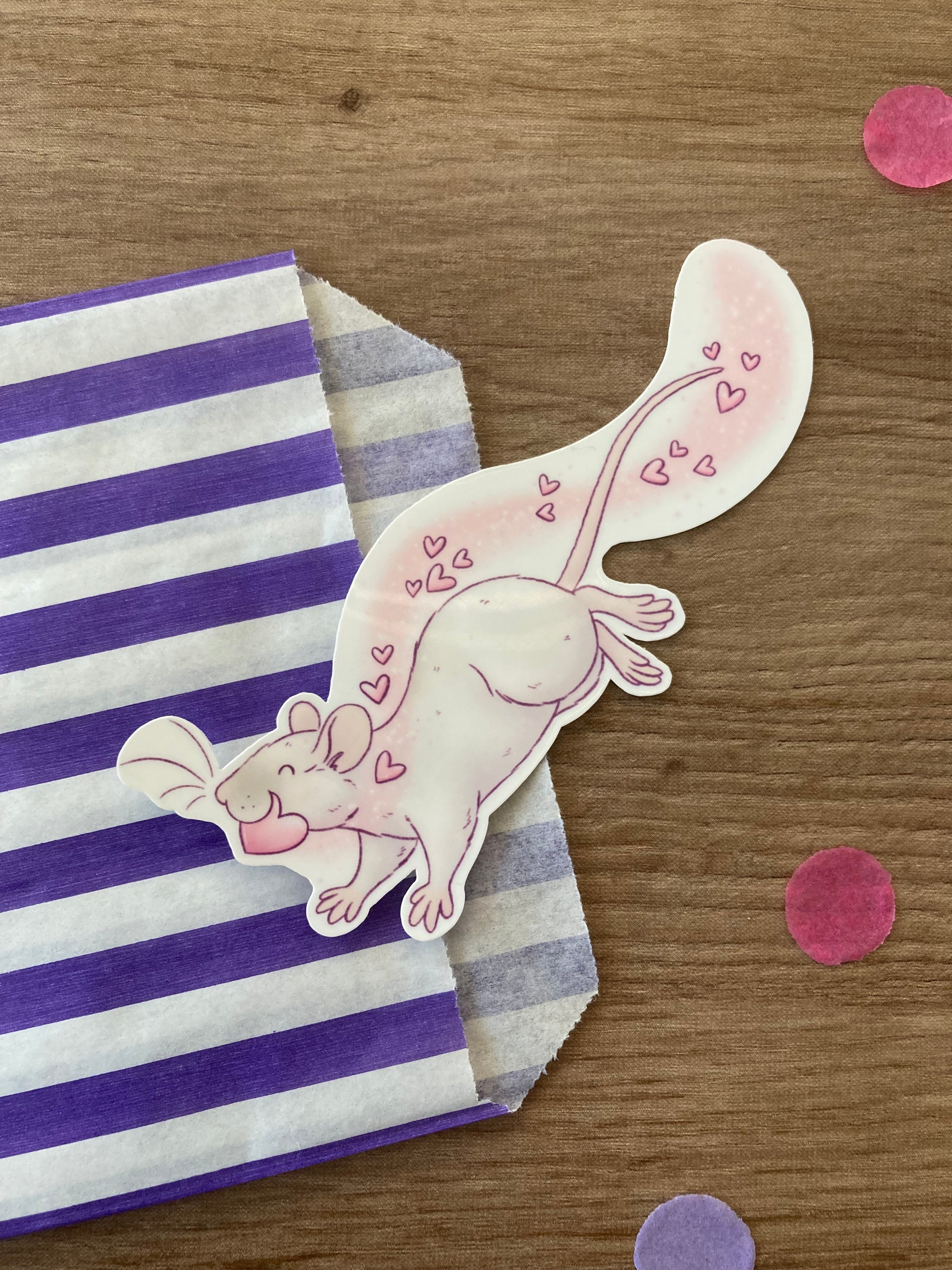 Spread the love around with this ratty vinyl sticker of Eugene the rat bouncing around sharing his heart. This design is printed on a glossy waterproof vinyl sticker.