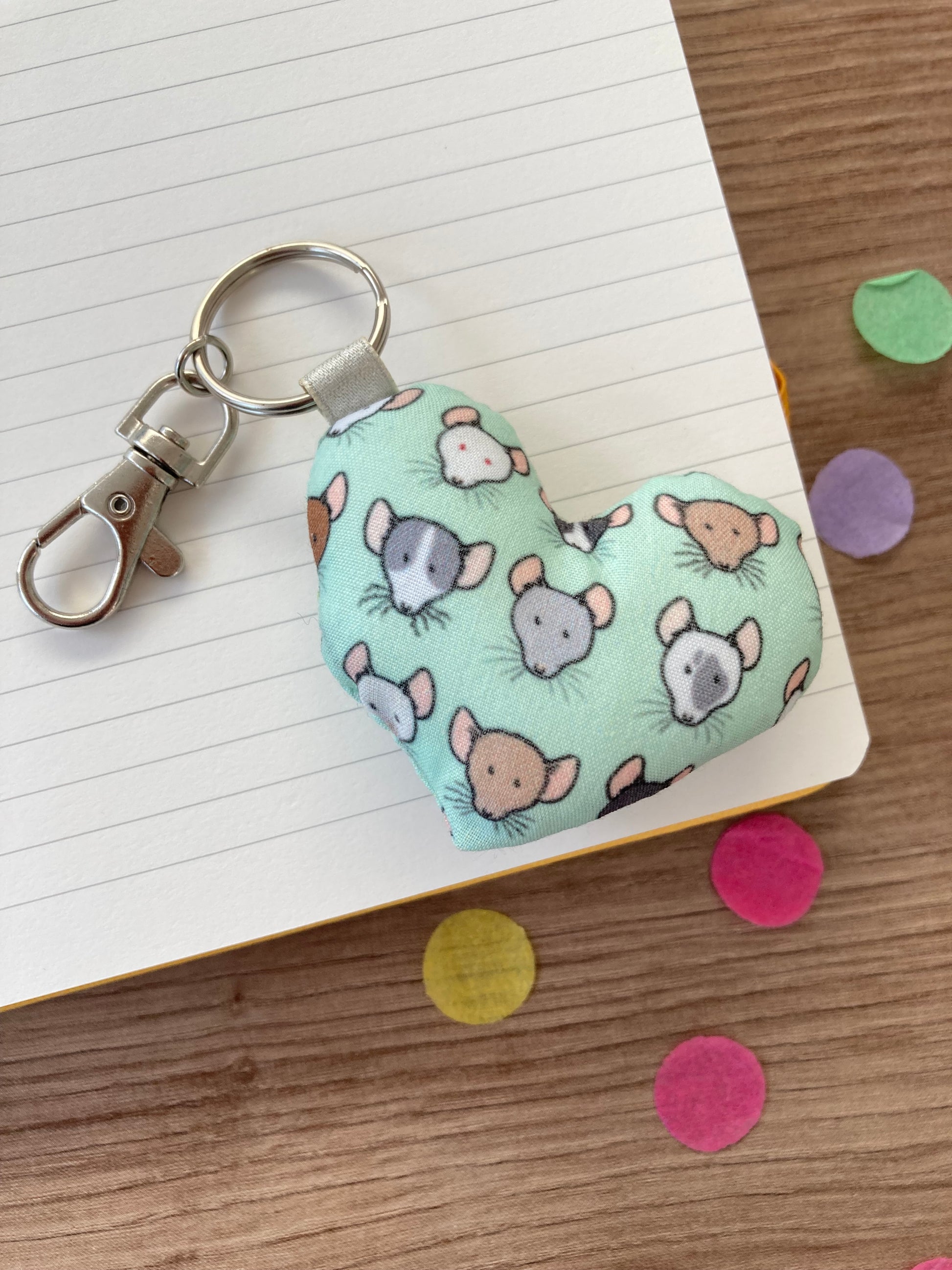 An fabric heart keyring with a rat design printed on the fabric, attached to a lobster clasp and ring