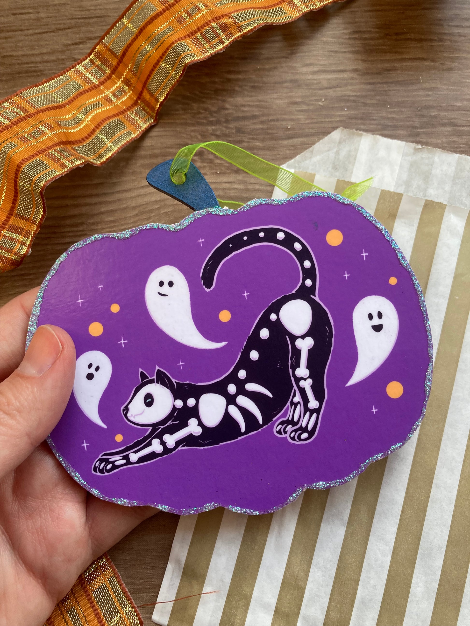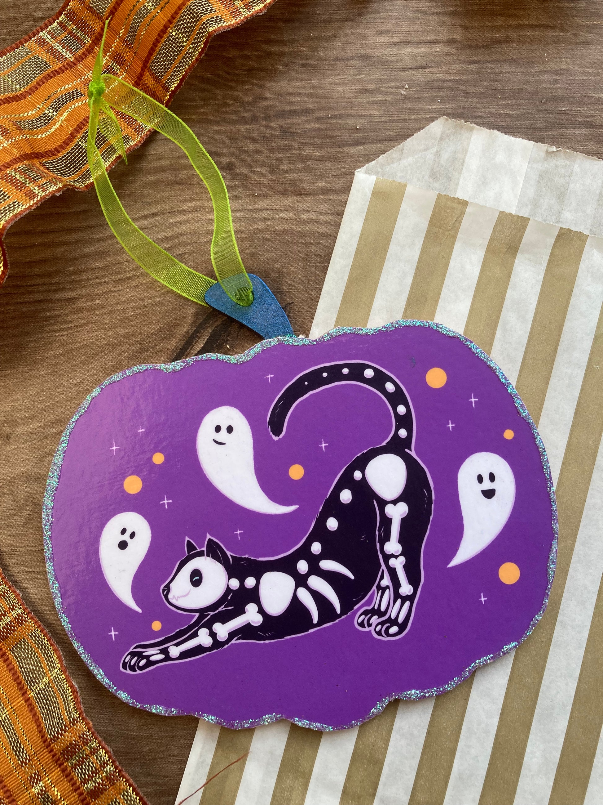 A wooden pumpkin shaped decoration featuring a cute skeleton cat design.