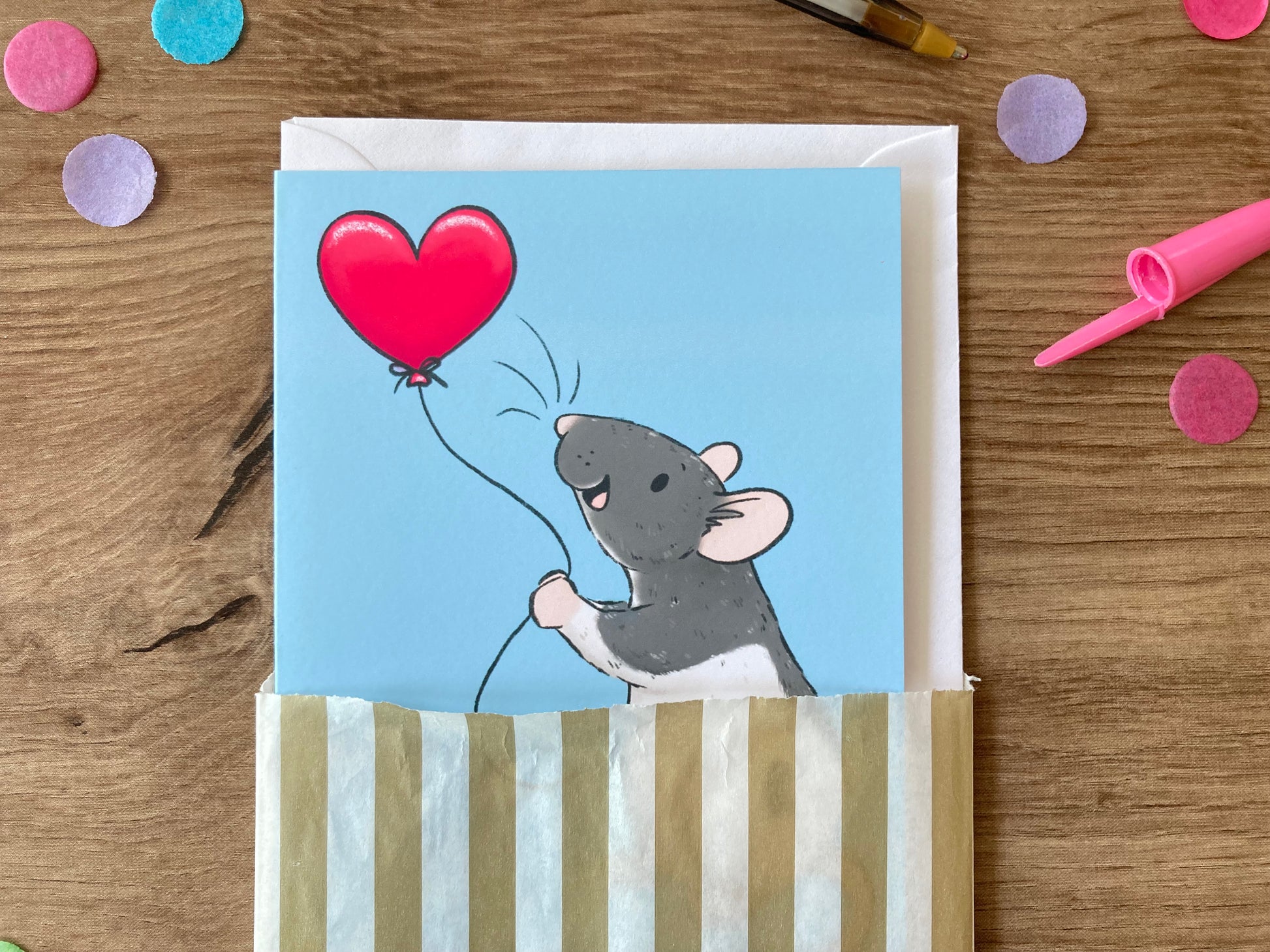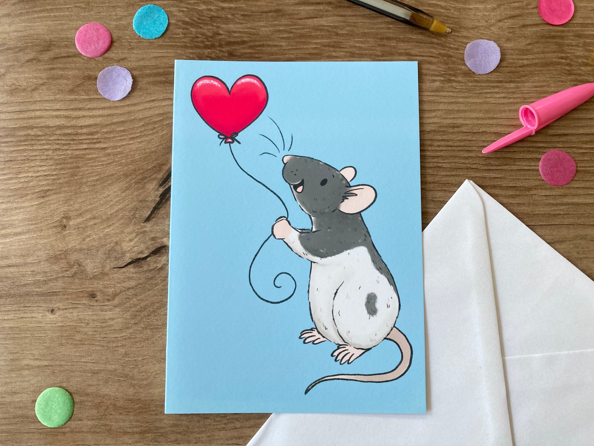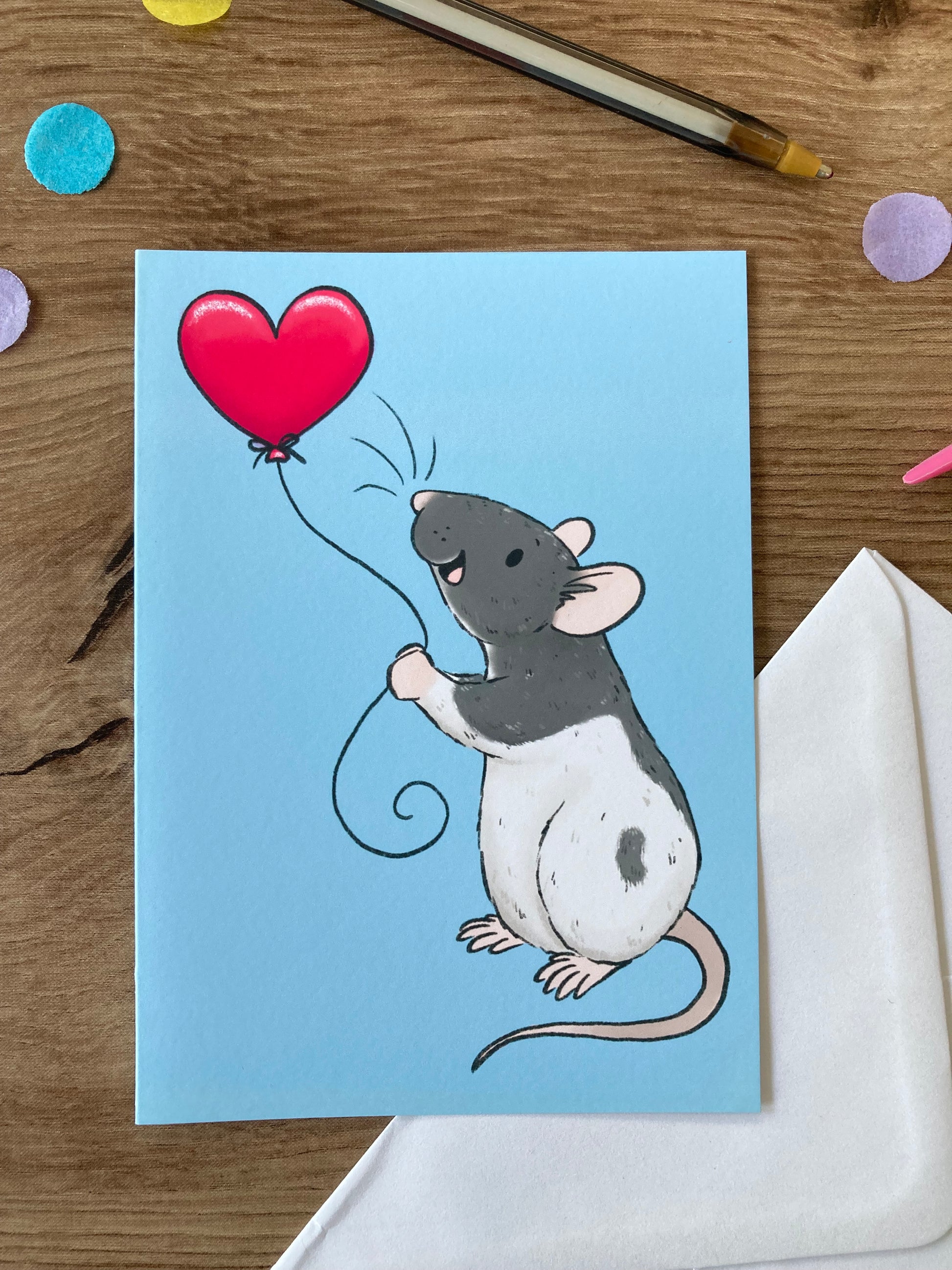 Heart Balloon Rat | Hooded Heart Rat A6 Greeting Card