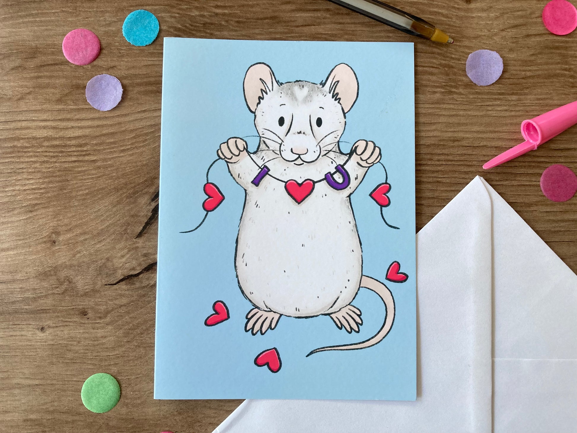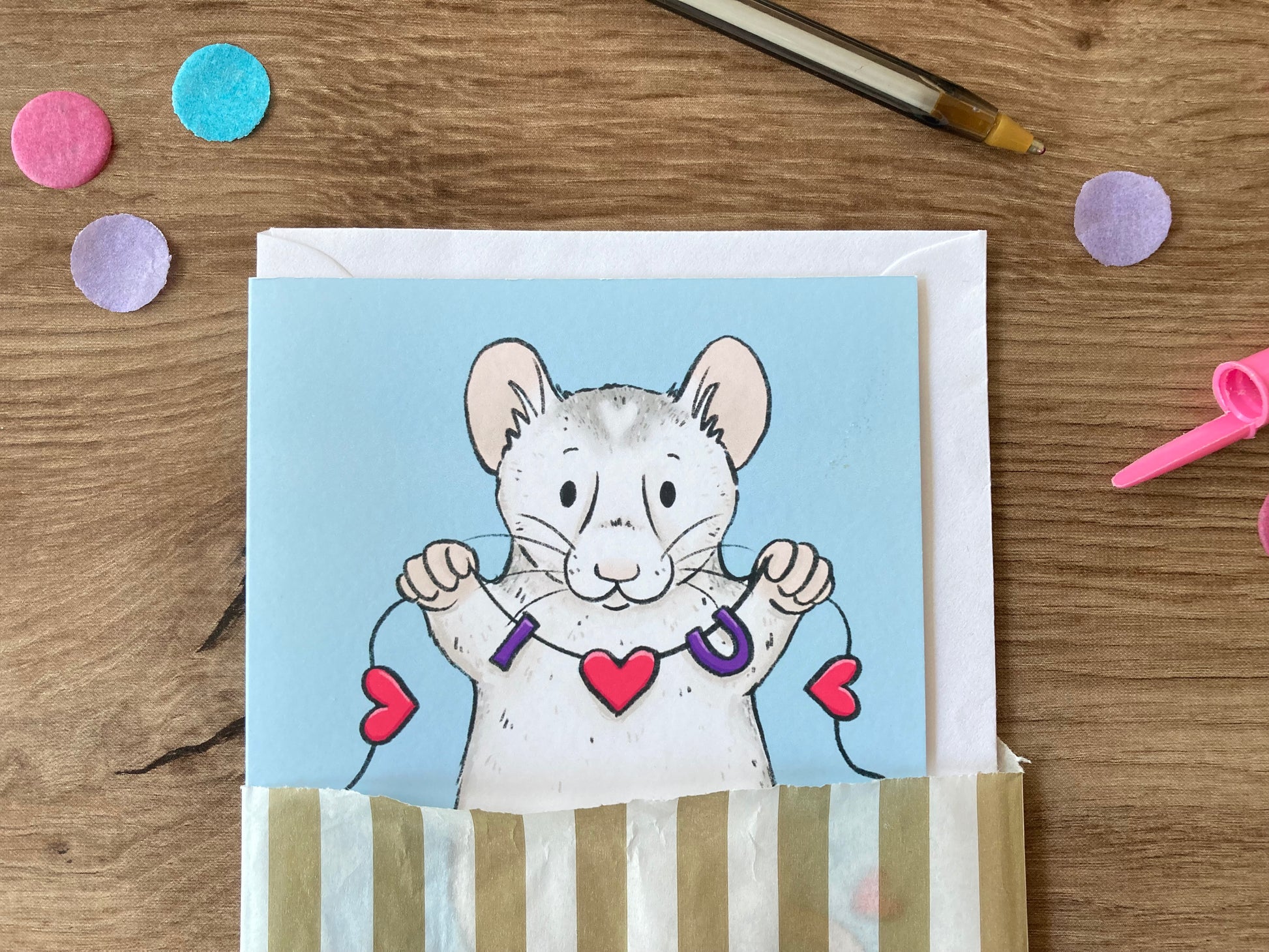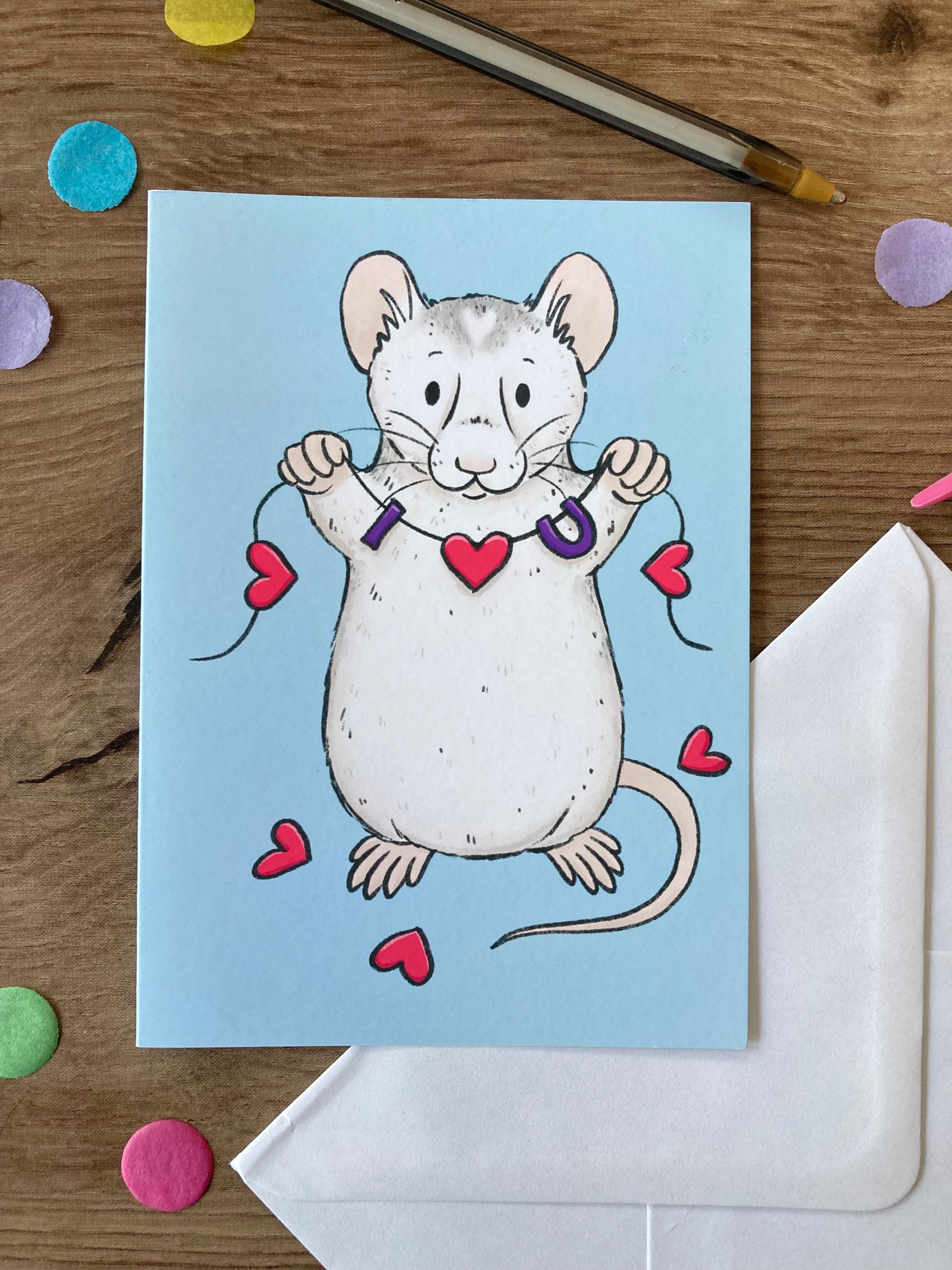 It features a cute little roan rat holding some heart bunting that reads “I heart U” in the centre.
