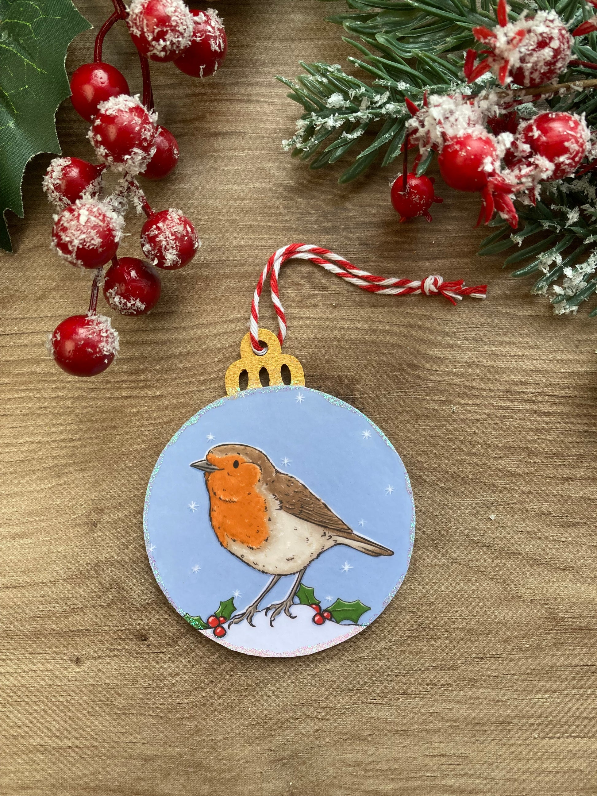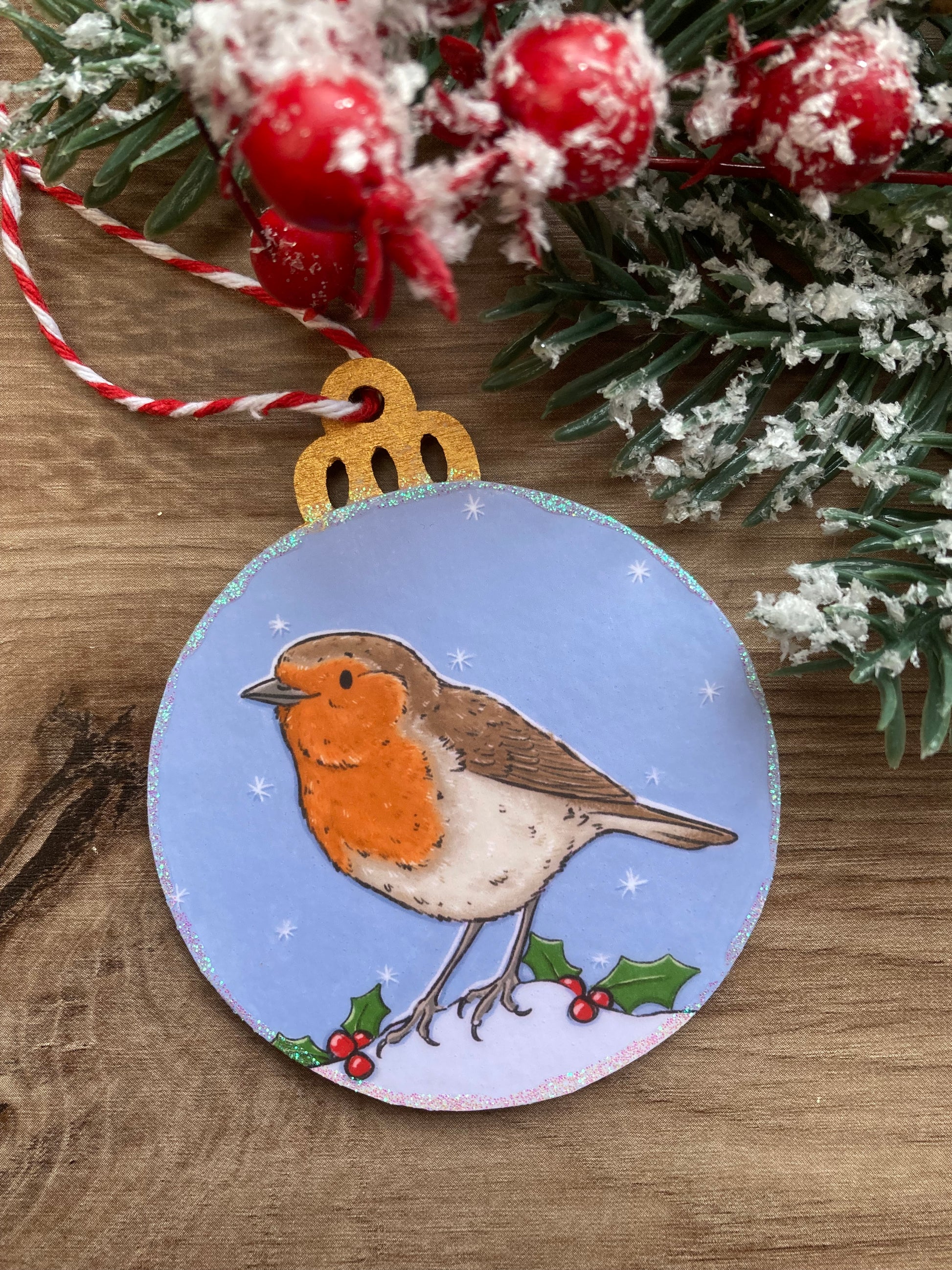 A fun little bauble featuring a cute robin sat in the snow with Holly ready to wish you a merry Christmas.
