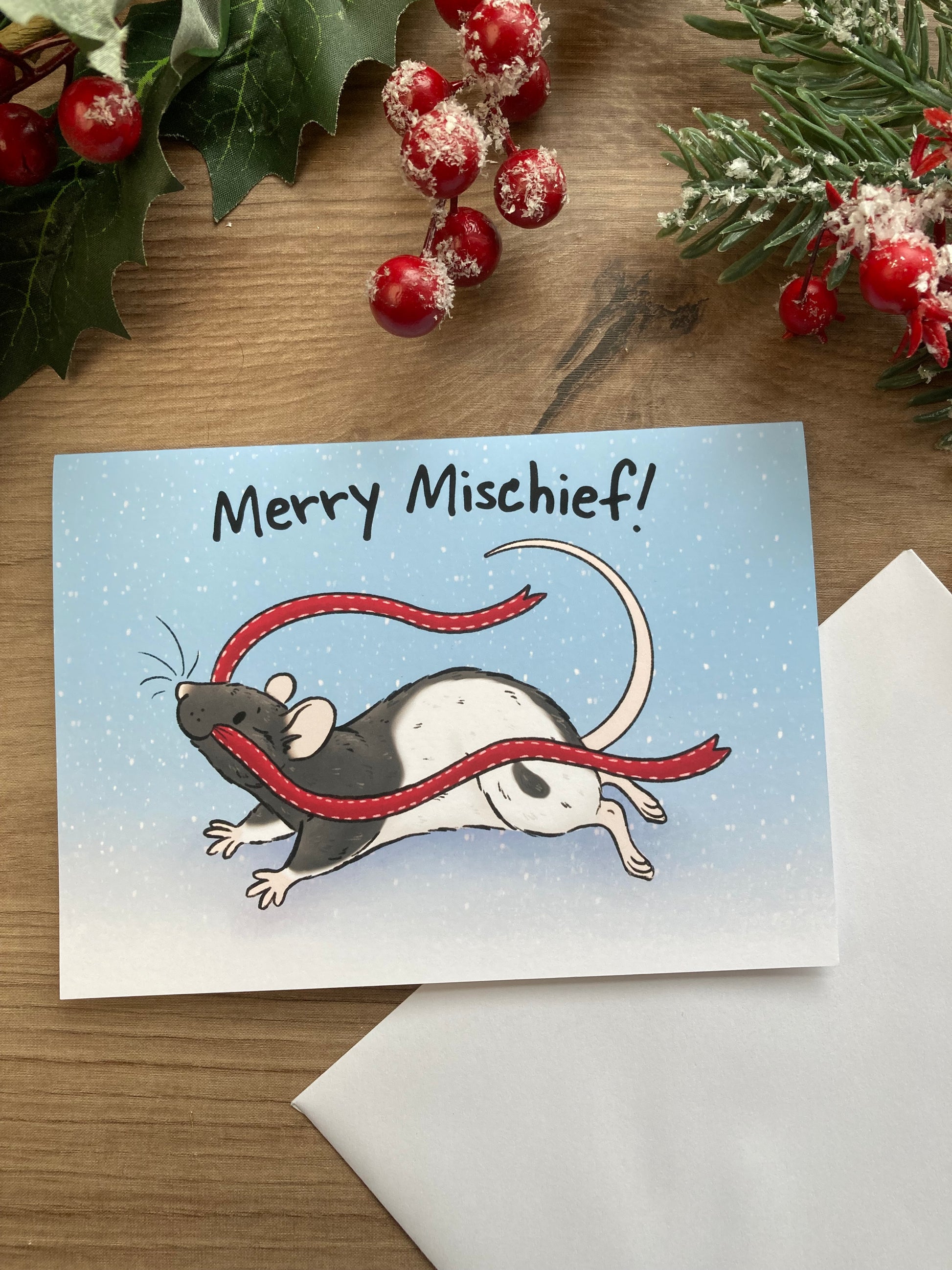 Have yourself a merry and mischievous Christmas with this cheeky rat card! Featuring a design of a rat stealing a length of ribbon, this card is the perfect gift for the rat lover with a very naughty rat!