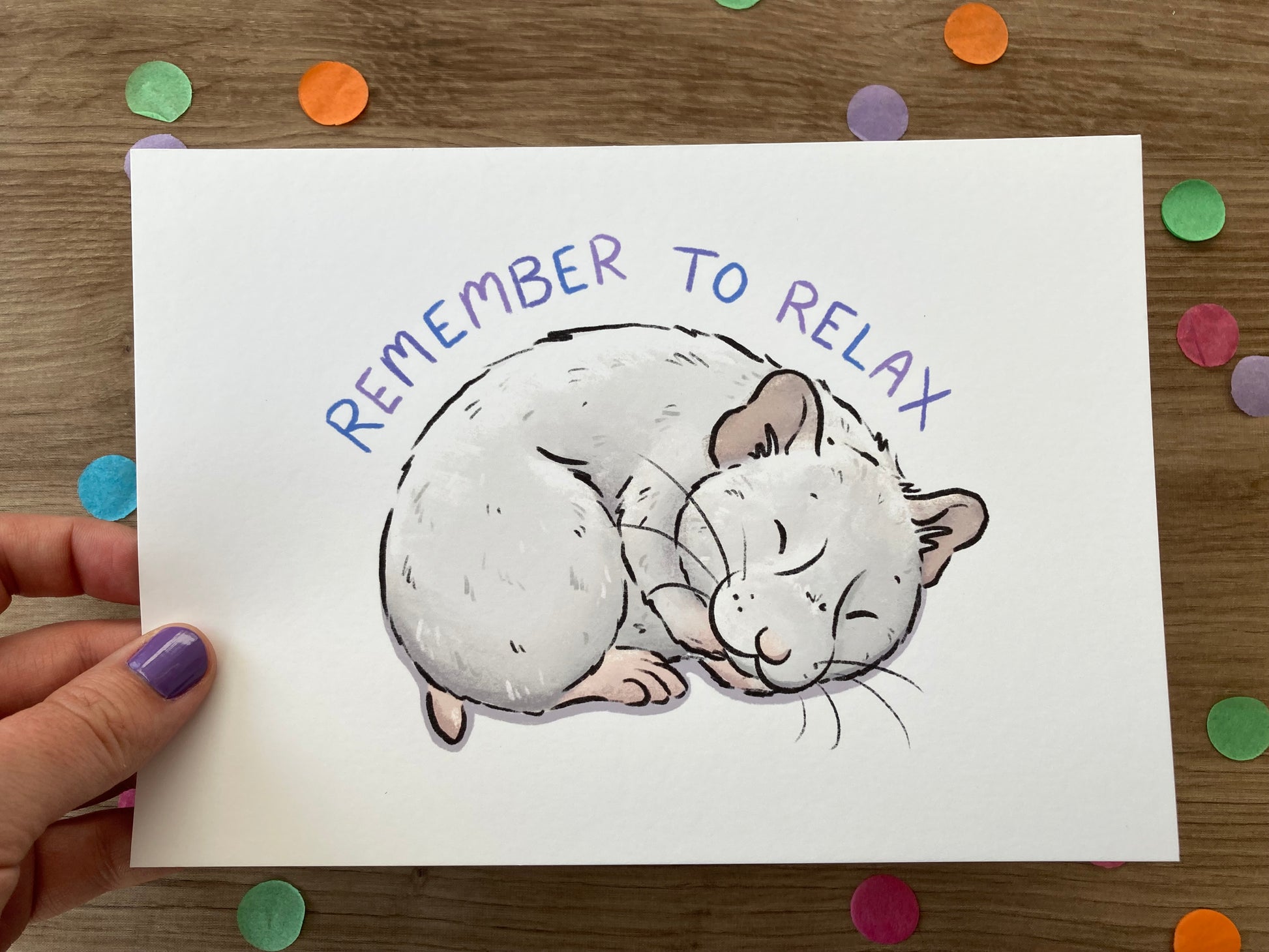 This art print is of a sleepy hamster curled up asleep with the words "remember to relax" over them. This design is part of the positivity series.