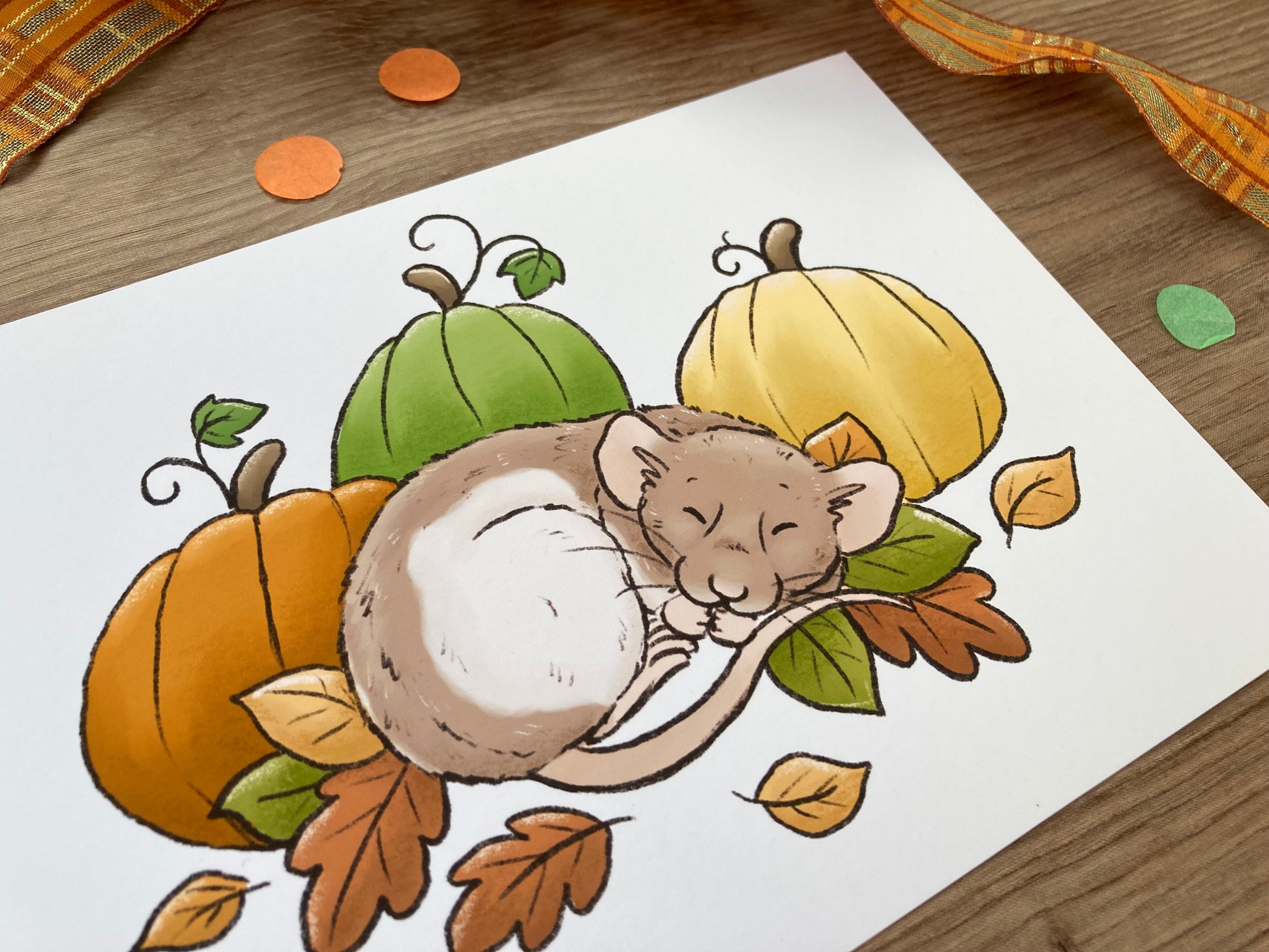 A cute autumnal art print featuring a rat sleeping against some pumpkins.