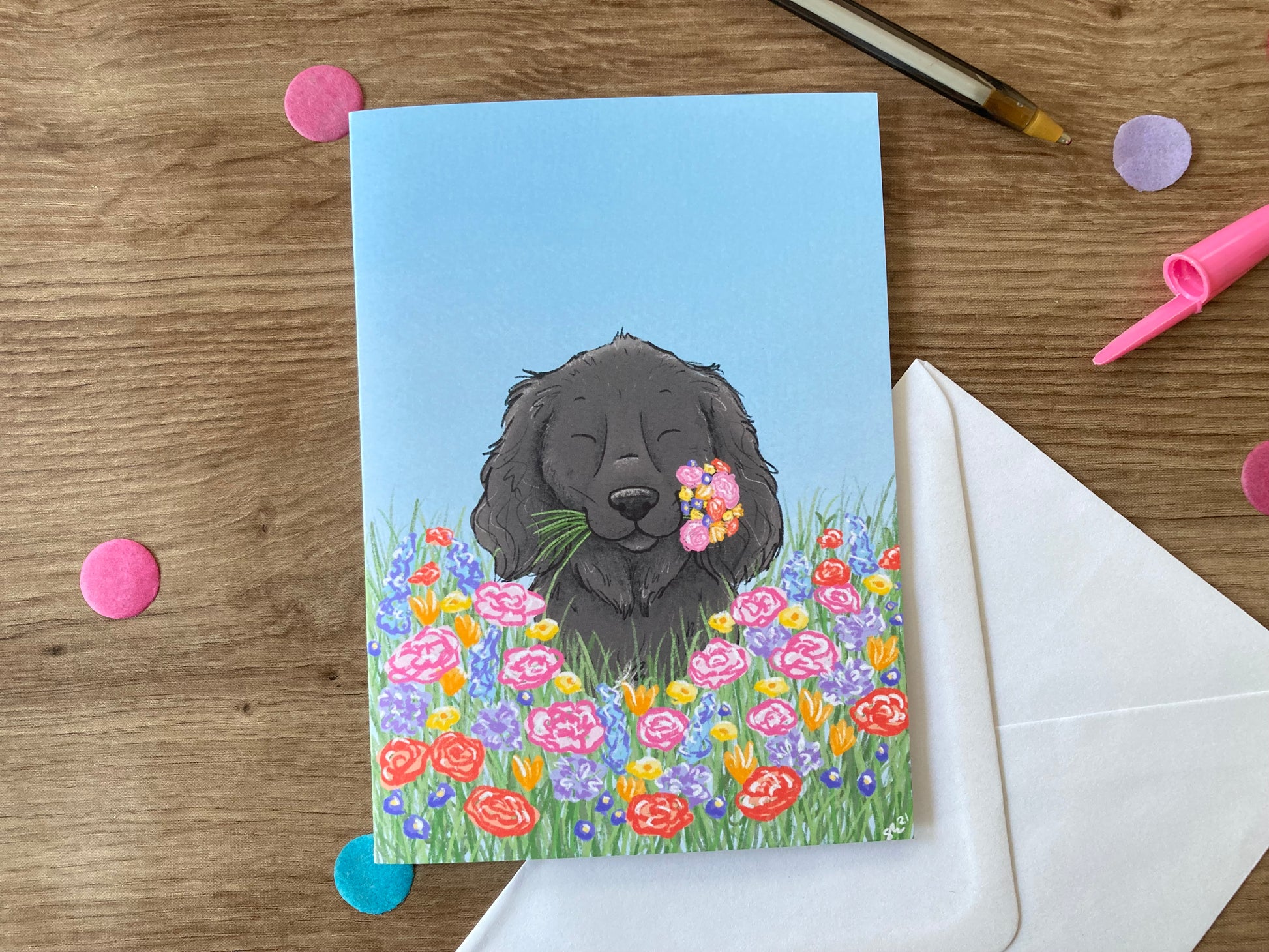 The card features a black spaniel based on the artists own dog, Merlin sitting in the middle of a field of bright colourful flowers holding a bunch in his mouth.