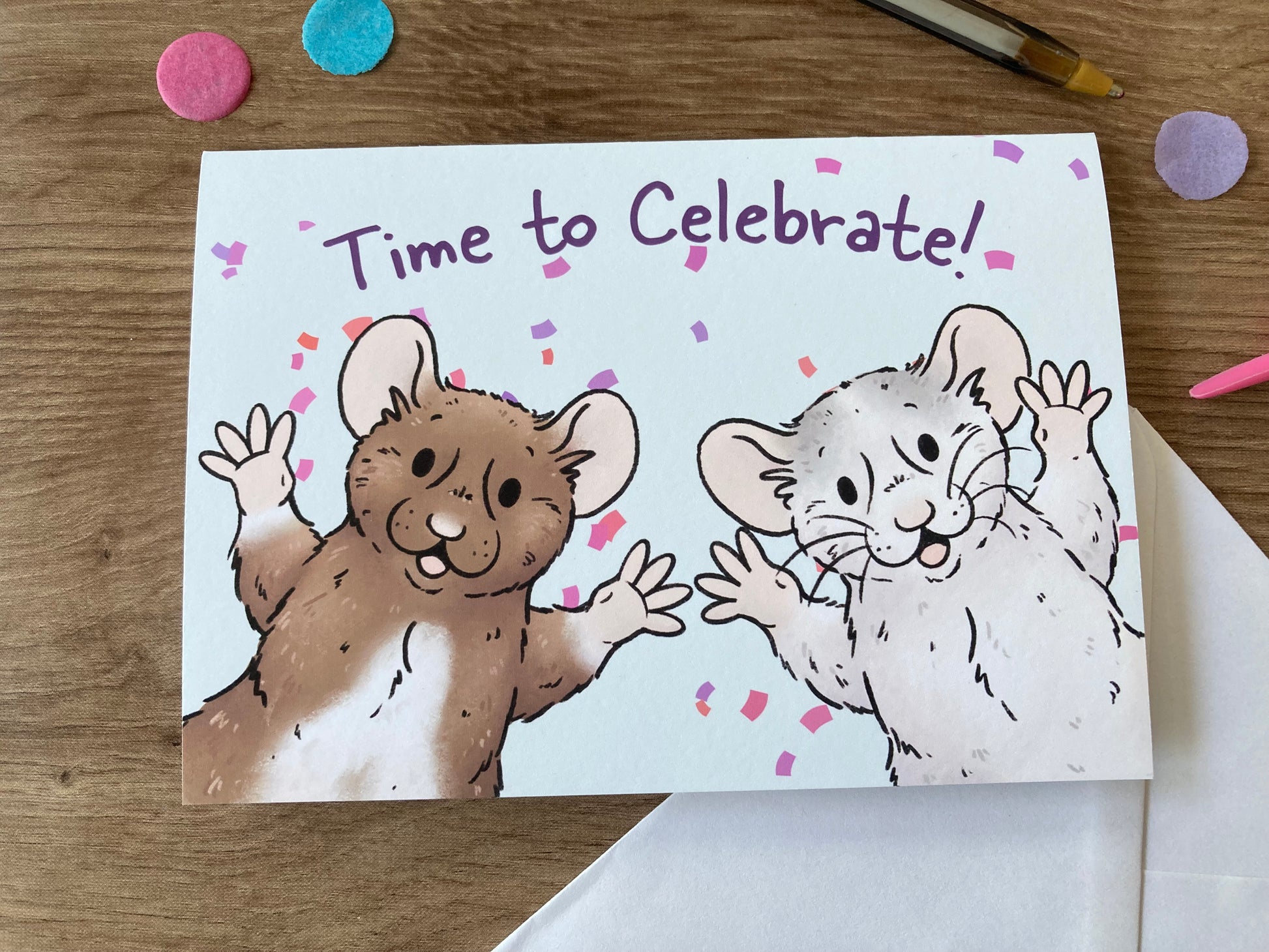 The card features a pair of happy rats surrounded by confetti with the words time to celebrate at the top.