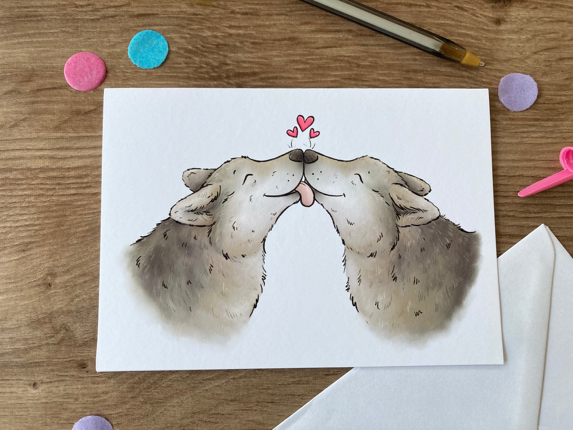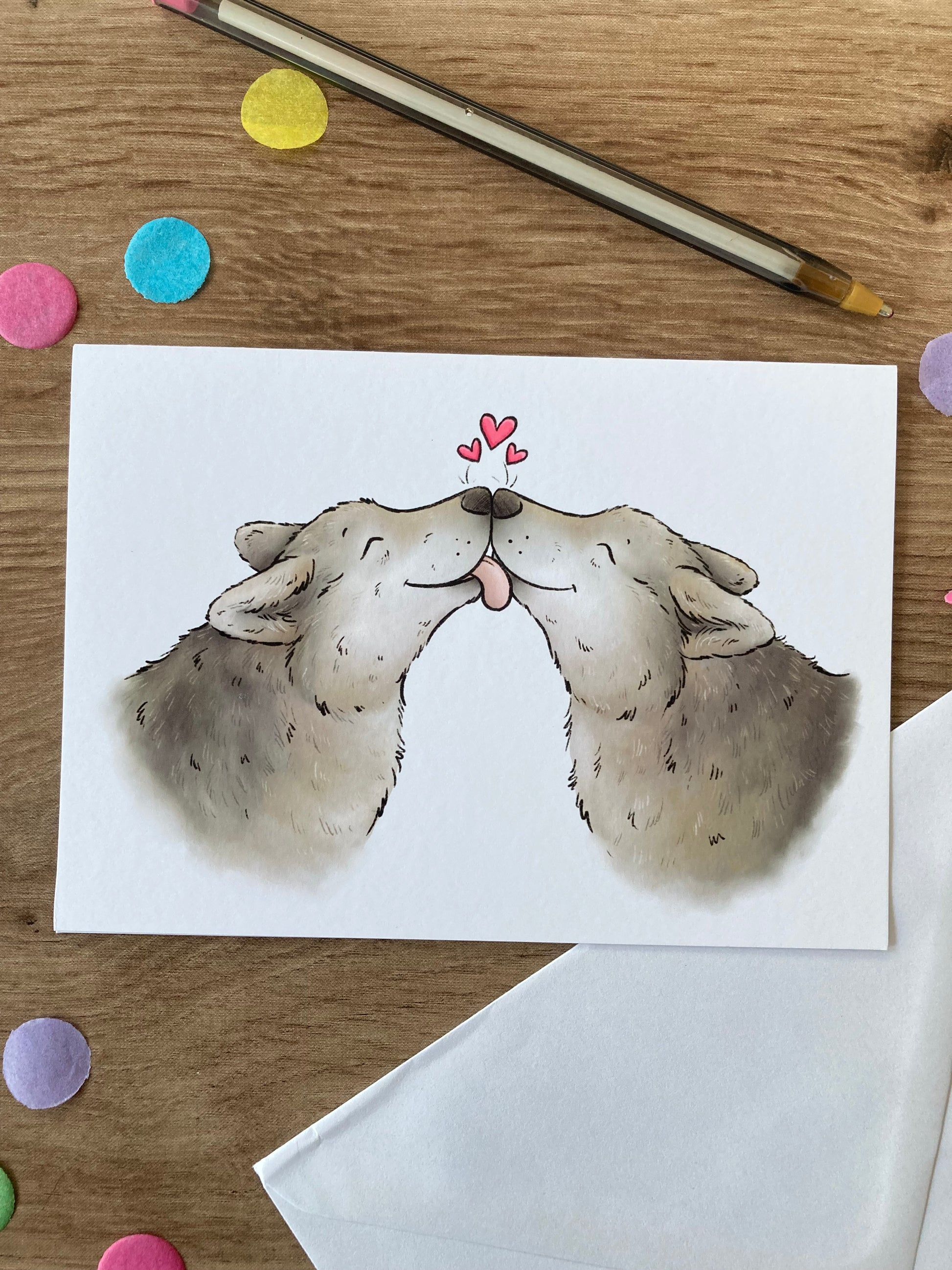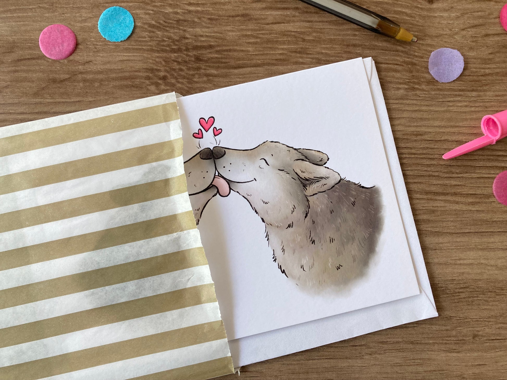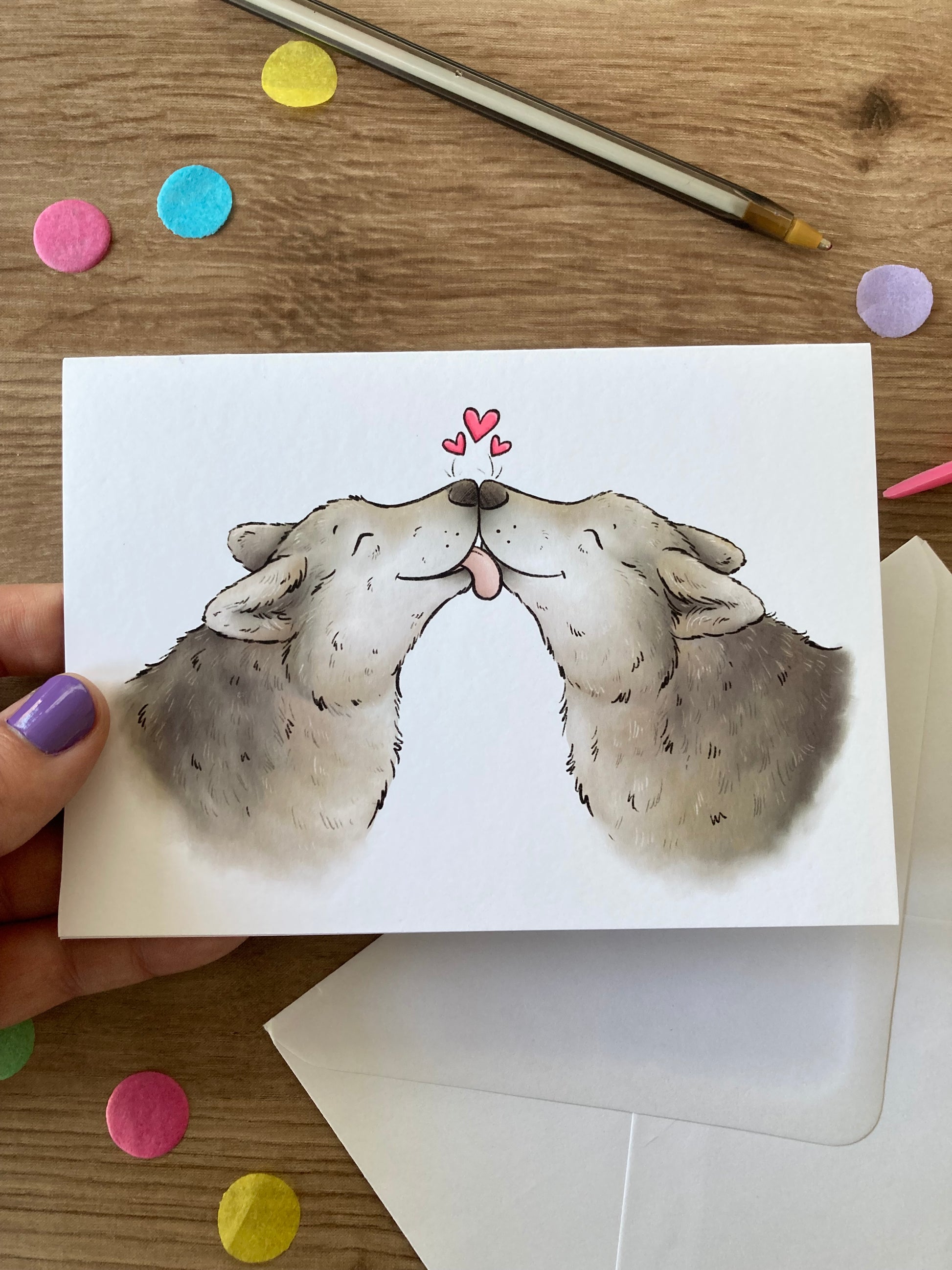A sweet wolf kisses greeting card with a couple of wolves touching noses.